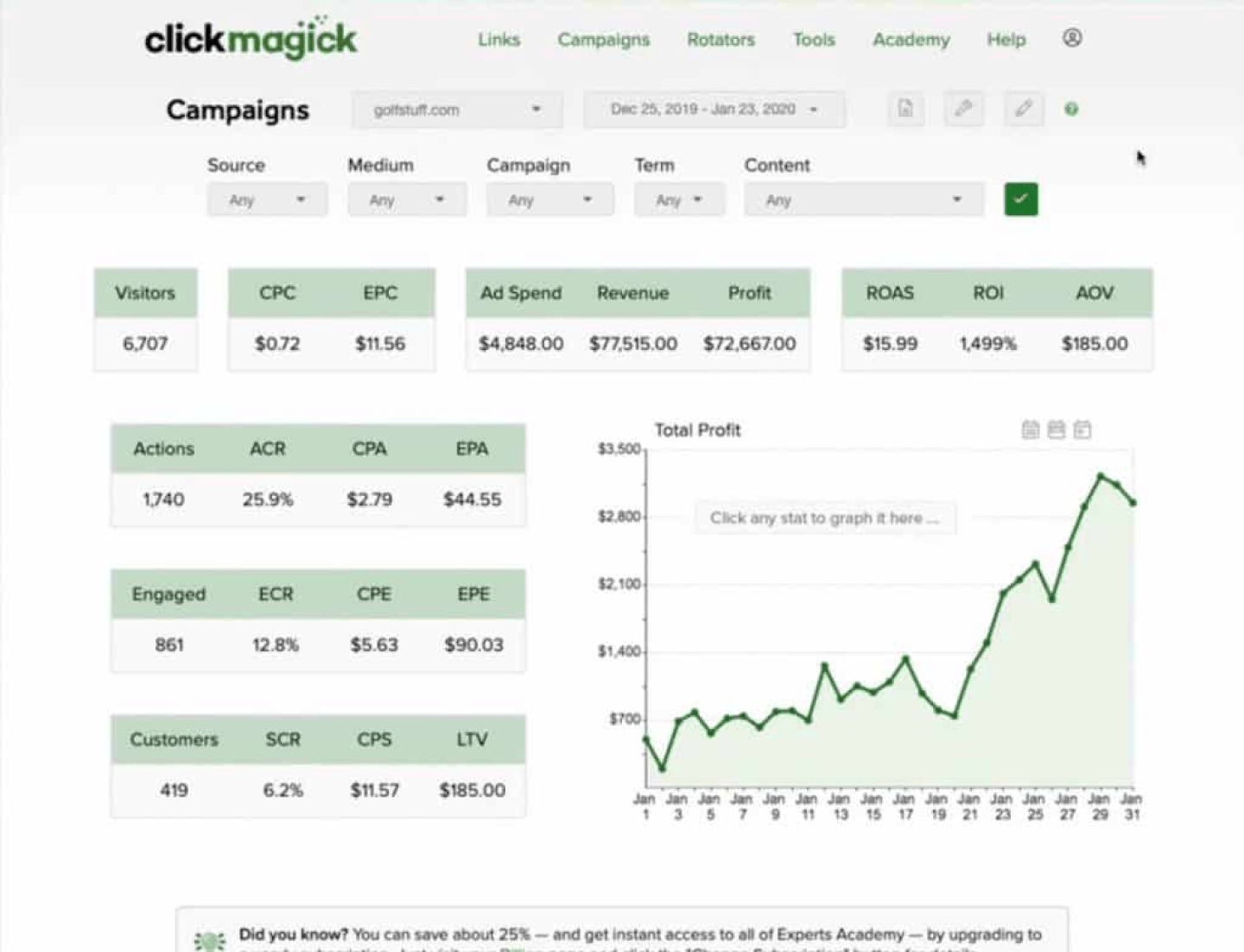 ClickMagick is an industry-leading affiliate tracking software with robust and diverse features. It's a tool that tracks link traffic from clicks across several devices and advertisements from various platforms. In other words, every single click from all regions that enter your campaign or website is monitored by this tool.