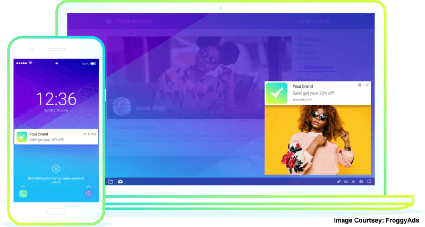 Push notification ads are new form of advertising that is based on the push notification communication channel that is built into every mobile devices sold today. In addition, it is also available on desktop computers and tablets as well. A user subscribes to a push notification service with explicit permission to receive messages from the subscription provider. Messages (aka paid ads) are broadcast directly to the subscribers via a secure channel. User receives the ads as notifications on his device as shown in an example below.