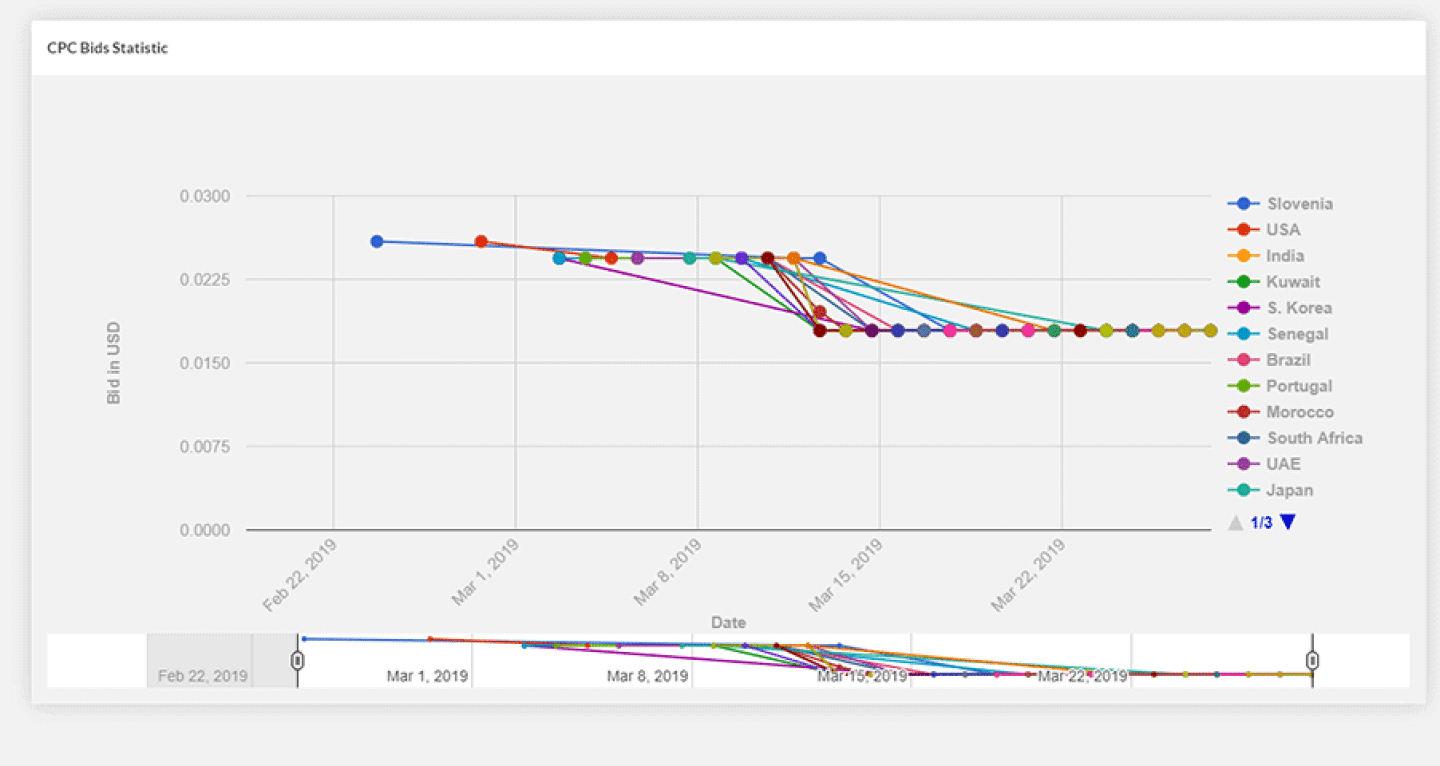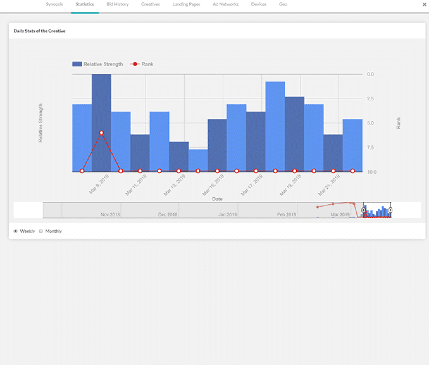 Whenever available, we record the CPC bids and provide you with a complete bid history of the creative. No other tool will provide you with this data. You will not only know how much to bid but also determine the success of the campaign from the bid trend.