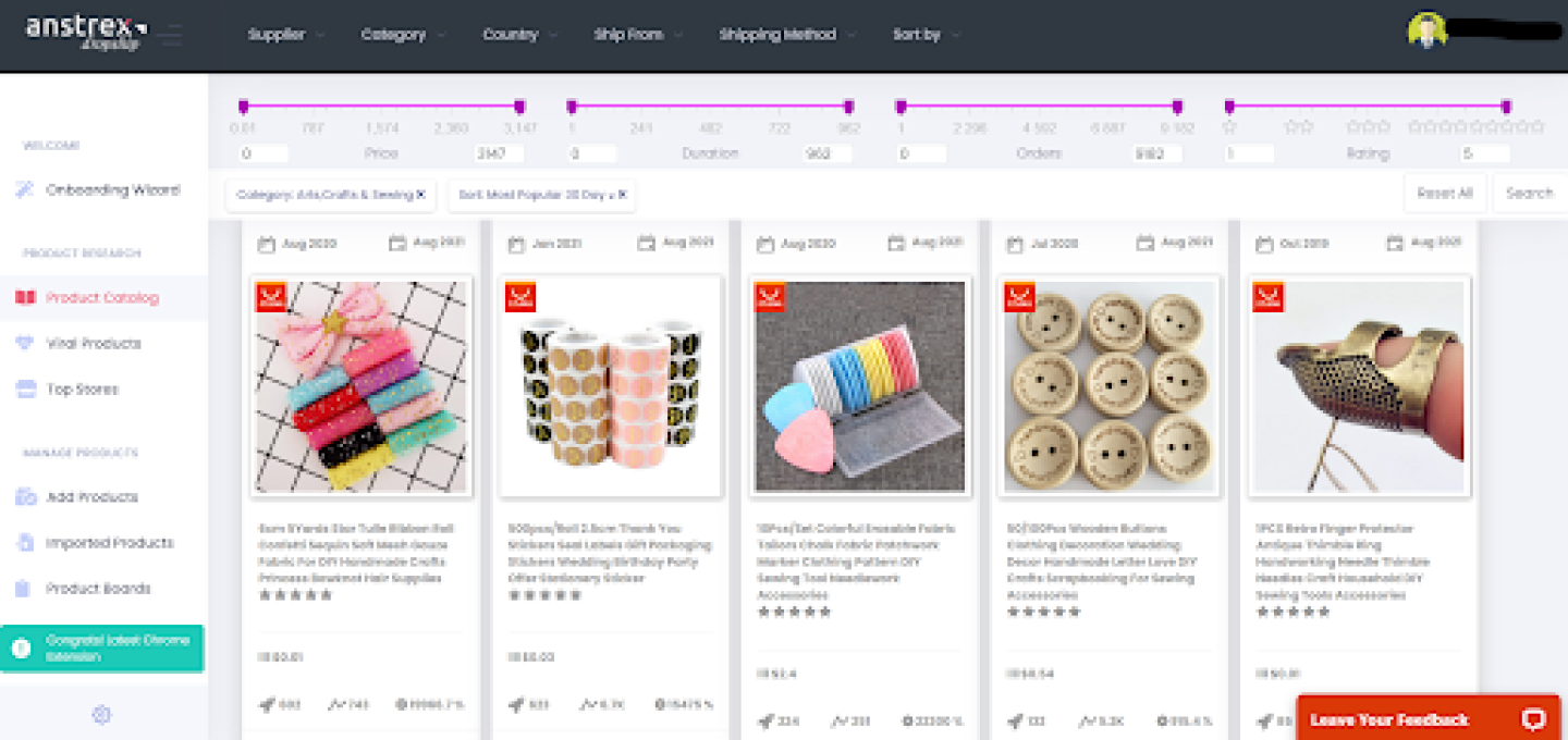 Once you have selected your filters and sorted the results based on popularity, your dashboard will display all possible results for your search. Anstrex’s Dropshipping tool has collated more than six million products in their database, so the more focused your search is, the better results you’ll get.