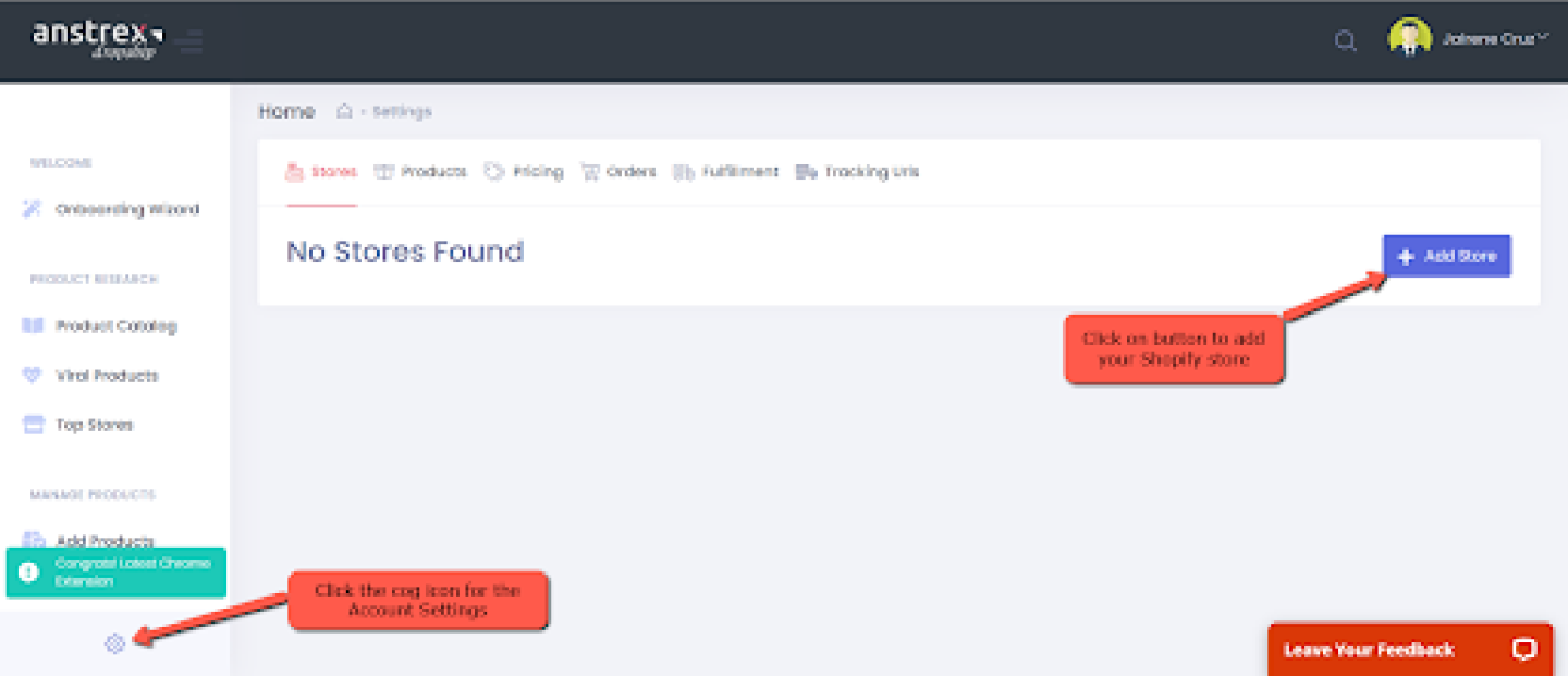 But before we do that, you must first connect your Shopify store account to your Anstrex account. The image below shows the simple procedure to do that:
