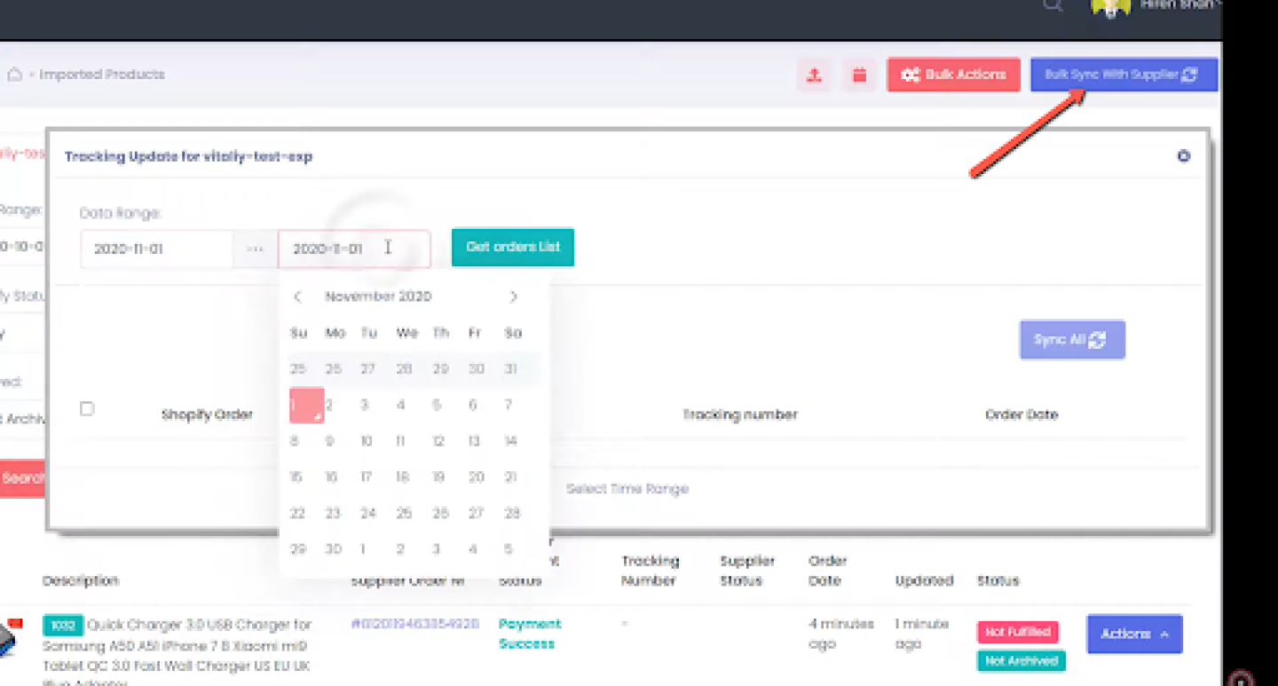 In the Track Order dashboard, you will see a list of your orders synced with your Shopify store. To update the status of the order as well as their tracking number, click on the blue button in the upper right corner, labeled “Bulk Sync with Supplier.”
