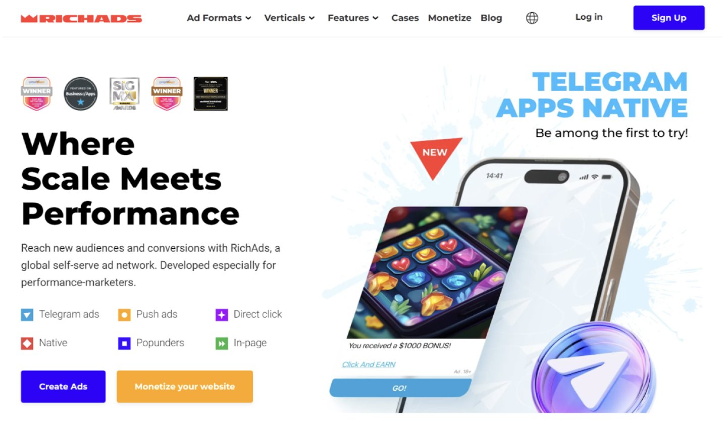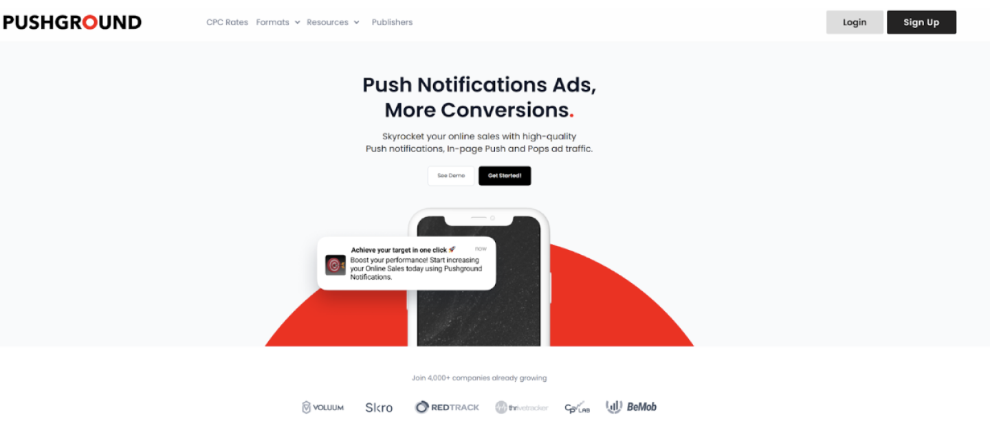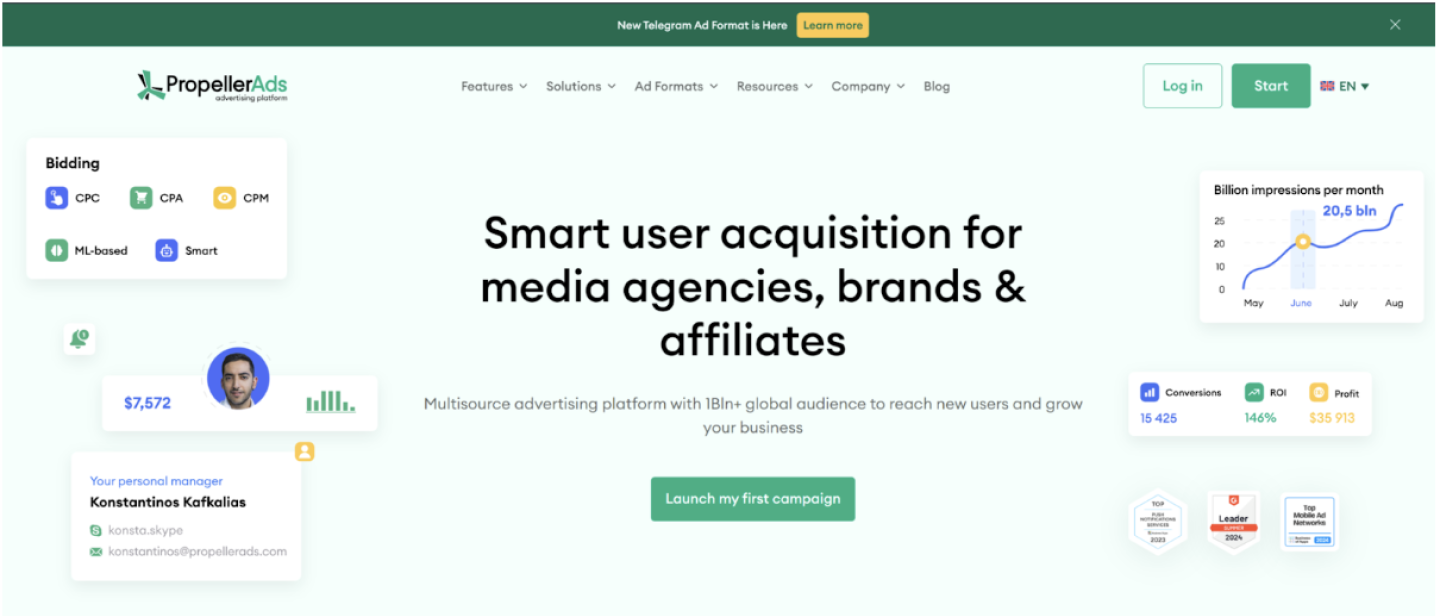 PropellerAds is an international multi-format network for monetizing any traffic, including push notifications. Founded in 2011, the platform quickly became one of the top push networks with 700,000 publishers worldwide. It offers formats such as push notification traffic, popunders, in-page push, and more. AdBlock bypass and manual moderation ensure high quality. The platform is one of the leading push advertising networks and has earned its place due to its high CPM rates.