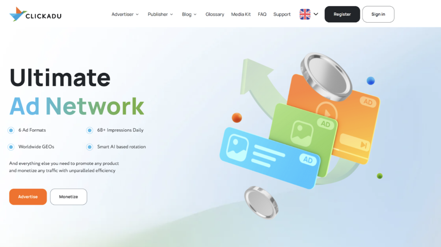 Clickadu is one of the top push ad networks specializing in low-cost traffic. Serving over 3,300 publishers, it generates more than 5 billion impressions per day. Clickadu allows you to buy push traffic profitably and monetize it through various formats. The network provides convenient tools for targeting setup and campaign optimization, enabling advertisers to achieve high results. In addition to push traffic, the network offers formats like banners, popunders, in-page push, instant SMS, video pre-rolls, and SKIM. All traffic undergoes strict internal filtering, ensuring its quality and effectiveness.