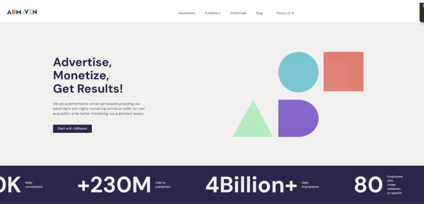 AdMaven is a universal ad network offering more than 2 billion impressions per day. It supports push traffic, banners, pop-ups, and interstitial ads. The platform ensures traffic filtering and effective push advertising. Advertisers can set up campaigns with optimization tools like New Bid Optimization and retargeting. These features make AdMaven a versatile tool for successful traffic monetization.