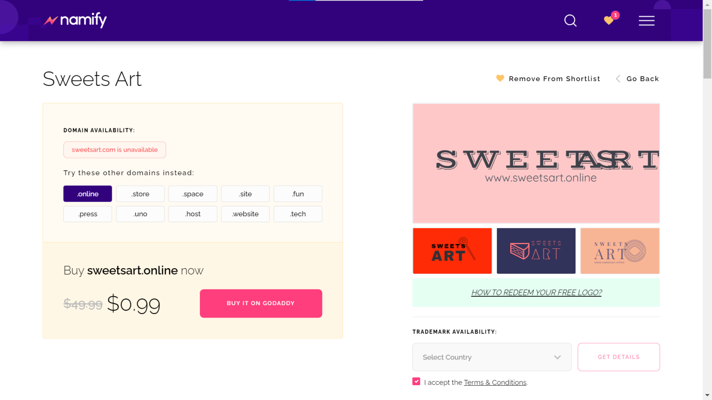 Вы можете добавить каждое название компании, которое привлекает ваше внимание, в короткий список, нажав на значок сердца рядом с ним. Если вы хотите узнать, в каких доменных зонах верхнего уровня (TLD) можно зарегистрировать название компании, нажмите на стрелку рядом с ним, и откроется новая страница.