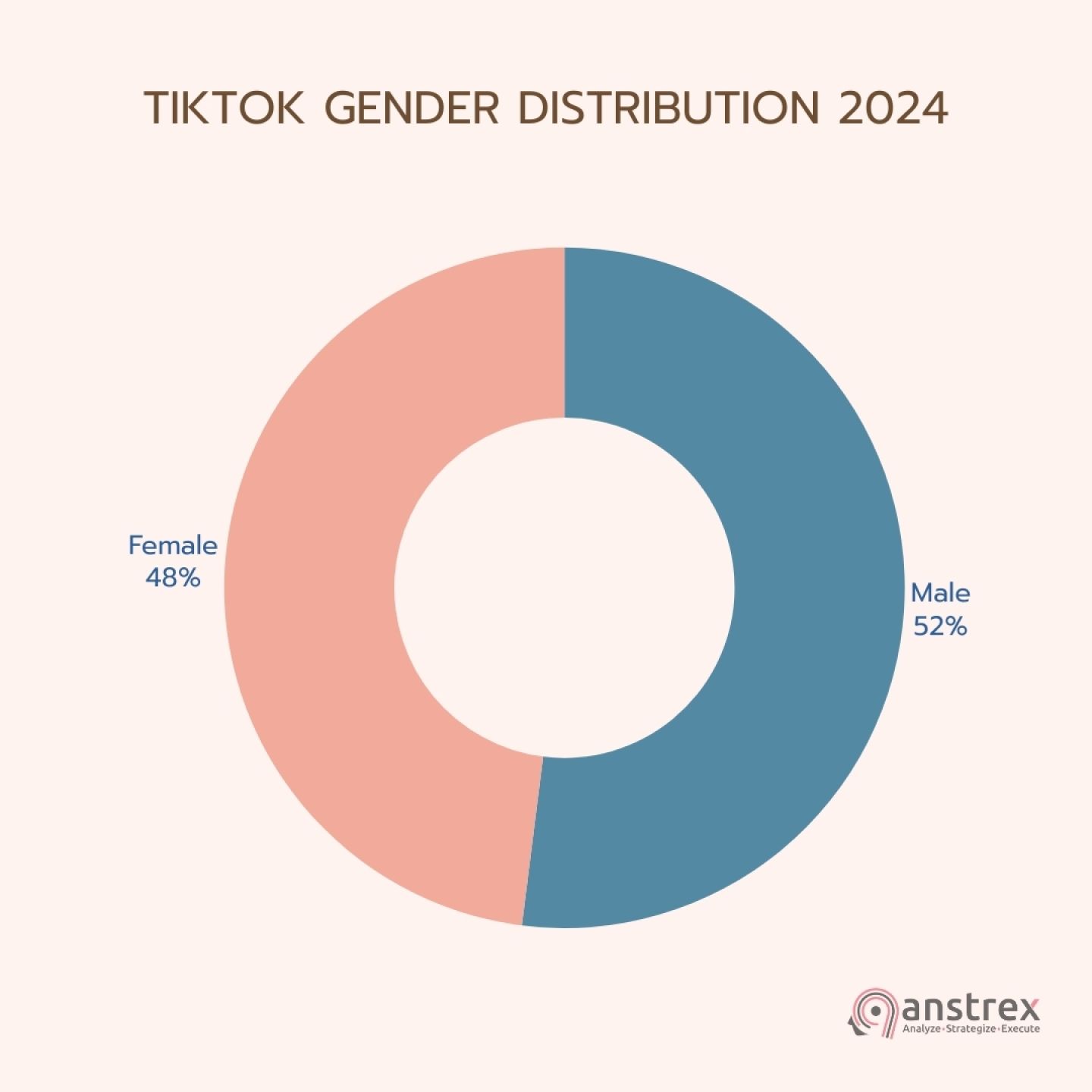 Аудитория TikTok разнообразна по половому и возрастному признаку. Распределение по половому признаку почти равное: женщины составляют 48%, а мужчины — 52%. Такое разнообразие позволяет компаниям взаимодействовать с широкой демографической группой.