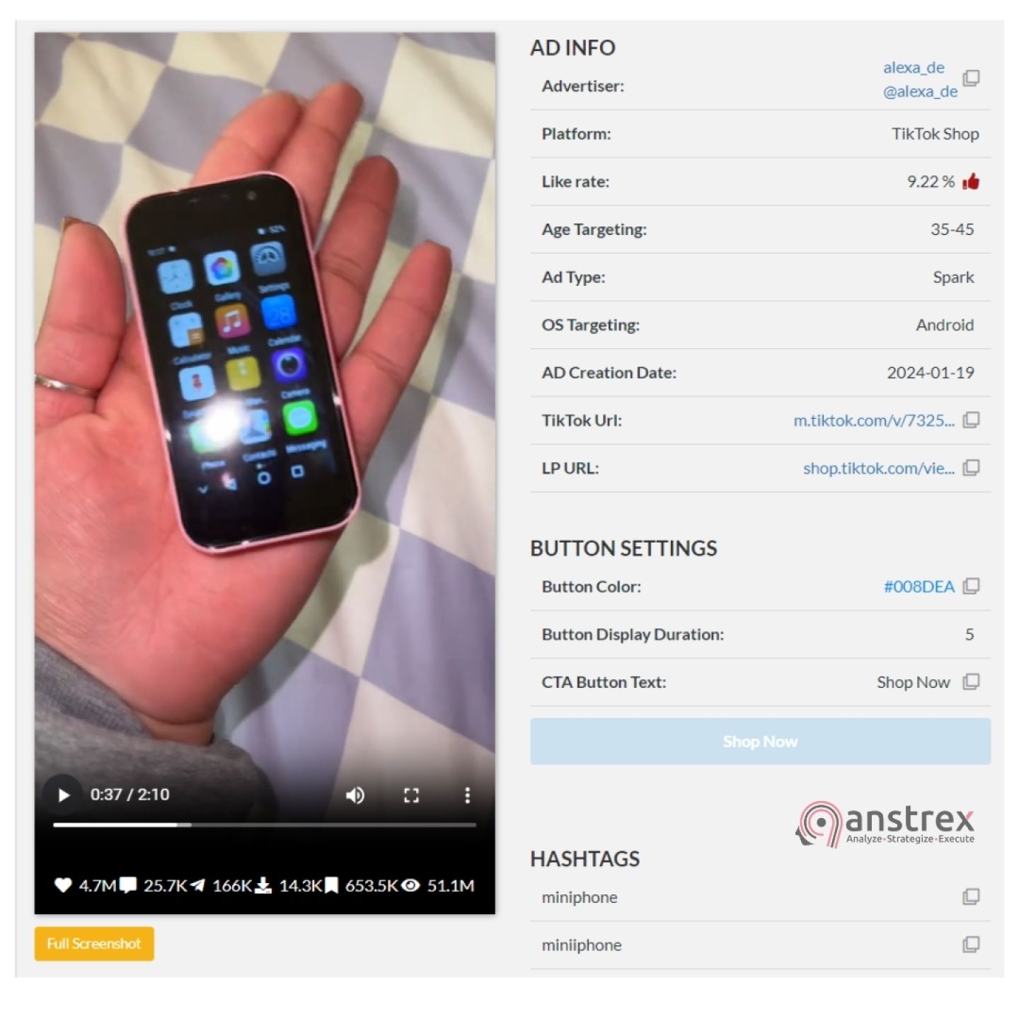 Например, поиск рекламы TikTok для трендового продукта "miniphone" показывает несколько рекламных роликов из разных дропшиппинговых магазинов.