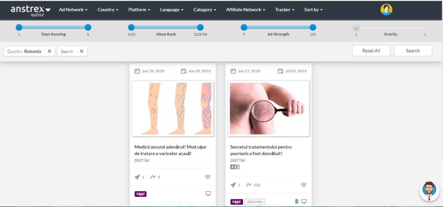 Как именно можно запускать проверенные рекламные объявления, если у вас нет опыта? Просто: используйте Anstrex. В нашей панели вы сможете фильтровать нативную рекламу по вашему офферу и стране. Вам сразу будут представлены десятки, сотни и даже тысячи рекламных объявлений. Они не только дадут вам понимание того, что возможно, но вы также сможете использовать те же самые креативы для своих объявлений!