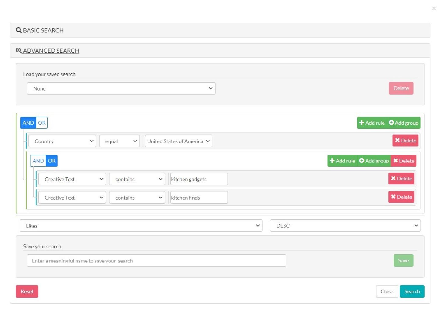 Ограничим результаты только Соединенными Штатами и поиском по тексту объявлений с ключевыми словами "кухонные приспособления" или "находки для кухни". Также отсортируем результаты по убыванию просмотров.