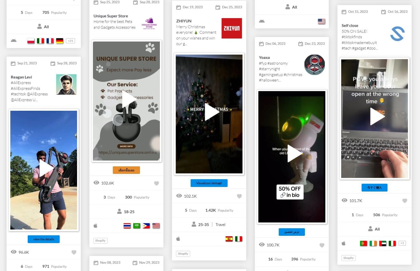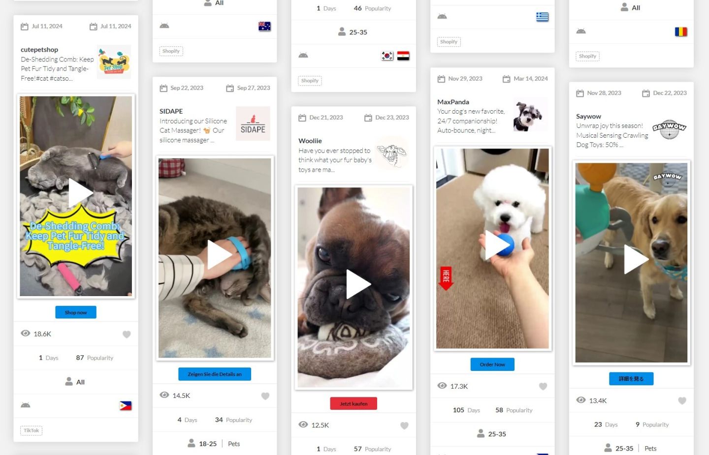 Точно так же, как и с нашей техникой и кухонными товарами, вы можете находить потенциальных победителей с помощью нашего надежного инструмента для слежения. Ищите видео по запросам вроде "аксессуары для животных", "игрушки для собак", "гаджеты для кошек", и исключите все крупные бренды, такие как Amazon, чтобы находить больше подходящих товаров для дропшиппинга.