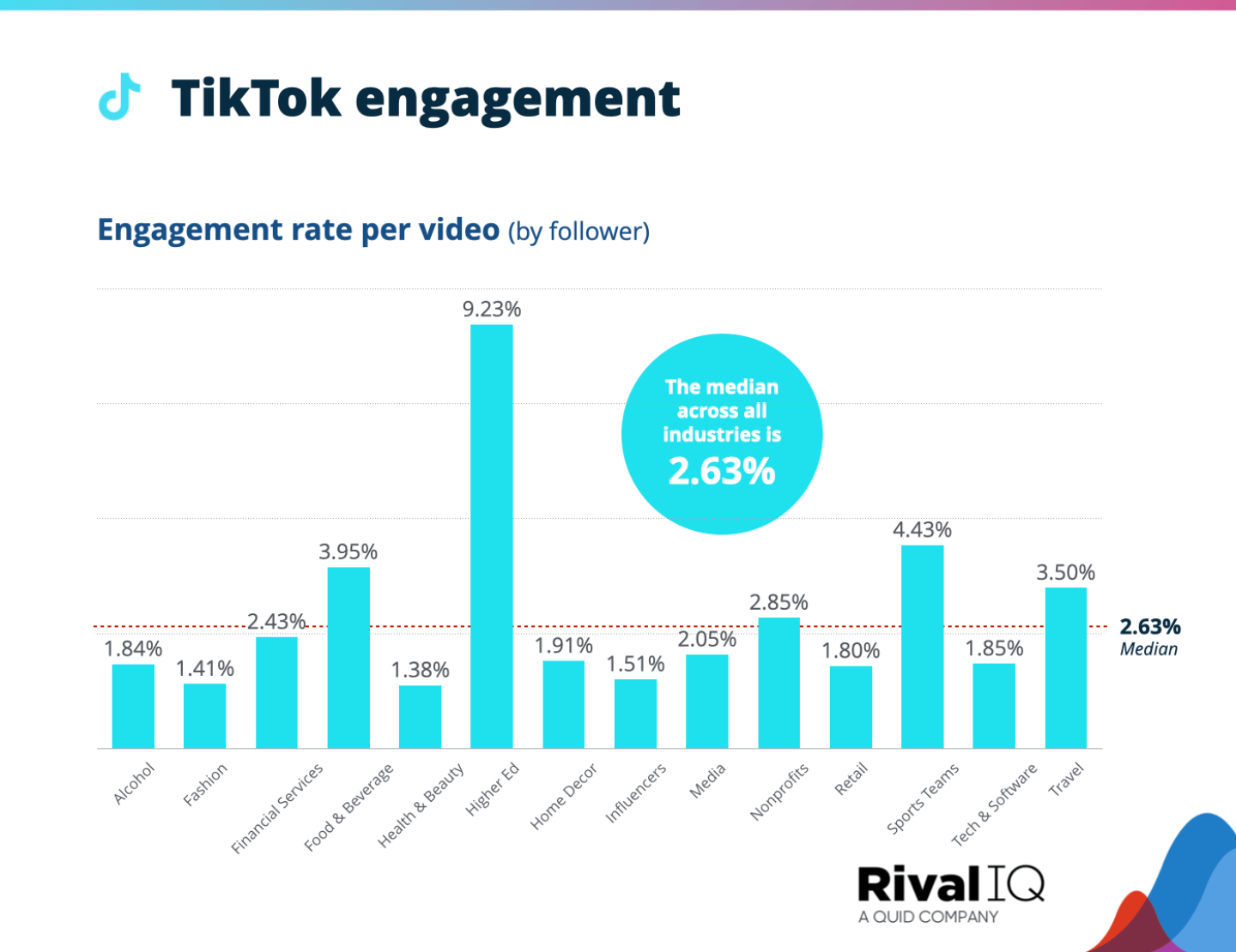 Согласно исследованию RivalIQ, медианный показатель вовлечённости по всем отраслям на TikTok составляет впечатляющие 2,63%. В отдельных нишах он составляет 1,80% для розничной торговли, 1,41% для моды, 1,91% для домашнего декора и целых 3,5% для туристической индустрии.